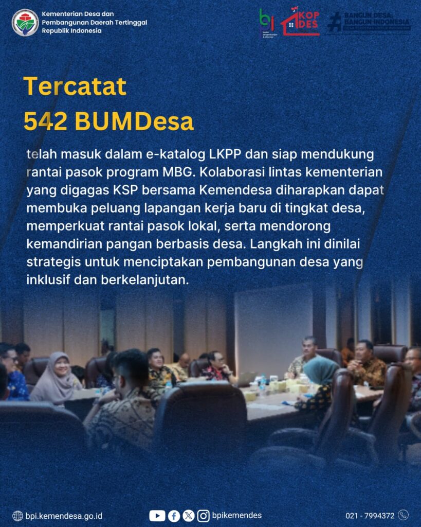 Tercatat, sebanyak 542 BUM Desa telah masuk dalam e-katalog LKPP dan dianggap siap secara permodalan dan SDM untuk turut serta menyuplai kebutuhan SPPG. Dengan kondisi ini, Dr. Drs. Mulyadin Malik, M.Si., CIGS, selaku Kepala Badan Pengembangan dan Informasi Desa dan Daerah Tertinggal mengusulkan dan mendorong pembentukan Tim Nasional Terpadu atau Satgas yang melibatkan Kementerian dan Lembaga, guna mempercepat profesionalisasi dan integrasi sistem BUM Desa dalam program MBG.